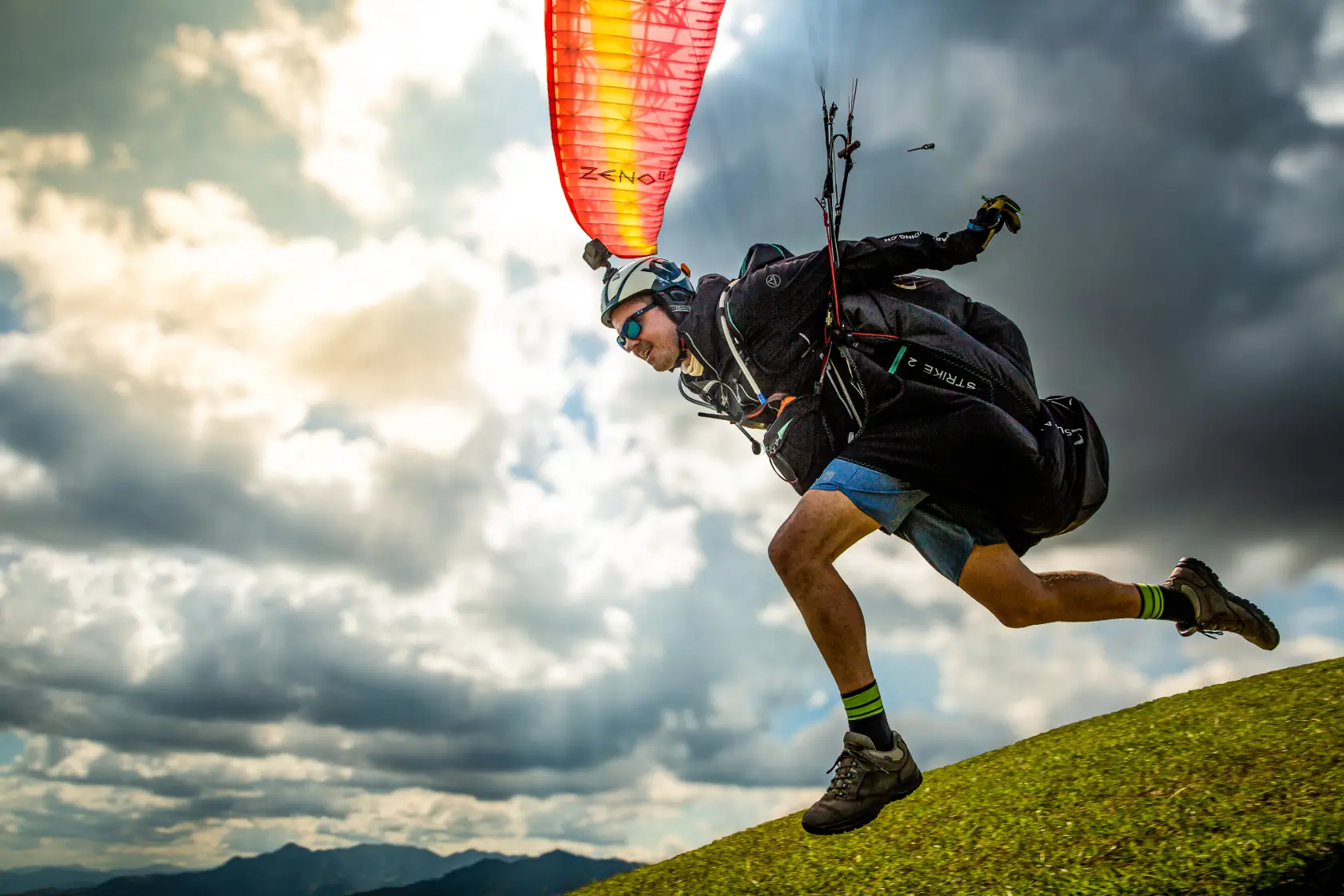 Gabor Kezi, ein Paragliding-Experte, startet mit seinem High-End-Cross-Country-Gleitschirm zu einem XC-Flug und zeigt dabei eine dynamische Bewegung und ein Lächeln.Grundschulung