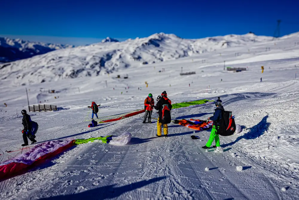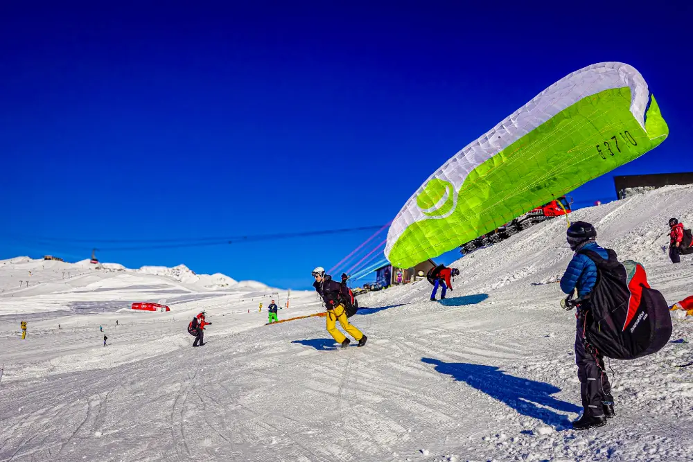 Gleitschirmpiloten geniessen das Saisoneröffnungsfliegen in Laax mit touch and go Paragliding.